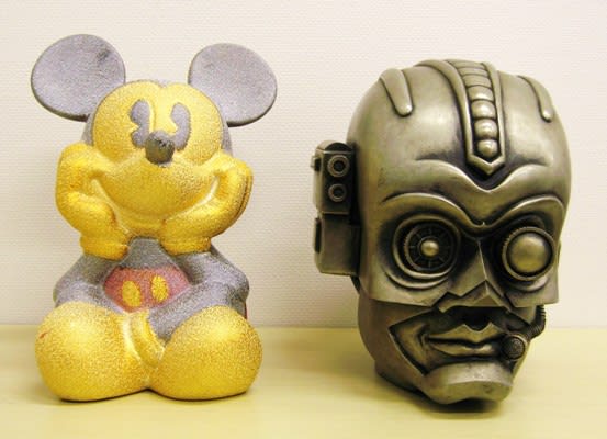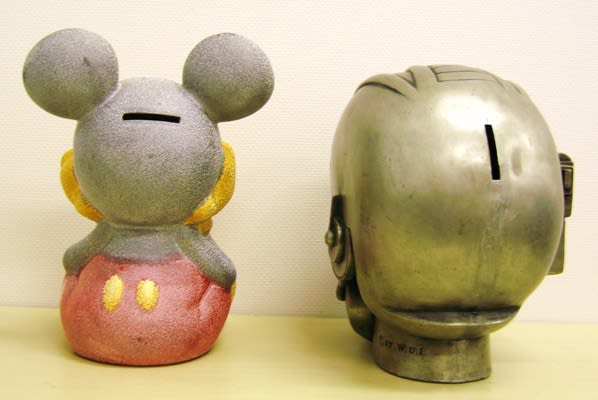 写真、左側、光輝くゴールドのミッキーの貯金箱、陶器製、高さ22.5センチです。こんな色彩の、しかも比較的大きなミッキーの貯金箱は珍しい。必要に応じ、インテリアとしての価値が高そうです。