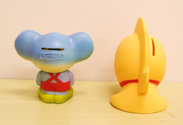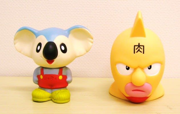 上の写真、左側、水戸証券のコッキーくんです。コアラの貯金箱、プラスチック製、高さ10センチです。右側、アニメキャラクター、キン肉マンの主人公キン肉スグルです。ソフビ製、高さ11センチです。「キン肉マン」は、1979年登場、「ゆでたまご」による漫画作品です。