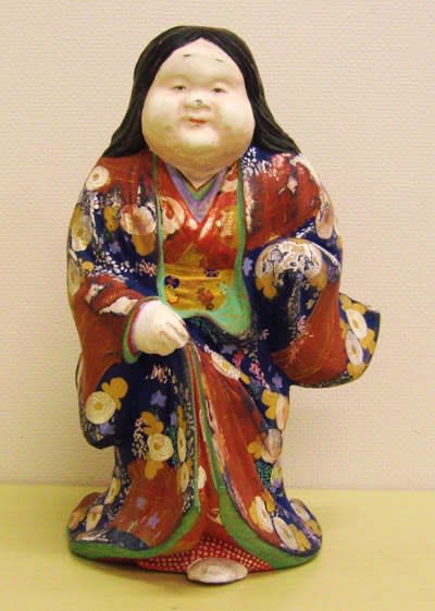おかめ(お多福)と言えば、顔だけが注目されるところですが、何んと素晴らしい着物姿のおかめの貯金箱を収蔵しました。