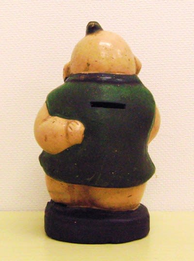 上の写真、陶器製で金メッキされた福助貯金箱、高さ12.5センチです。
