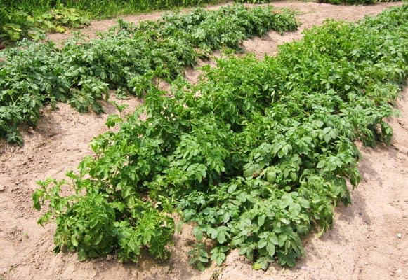 上の写真、雑草取りも終わり、一段と元気さが目立つジャガイモです。今月中には収穫します。一年間分の我家の食材です。