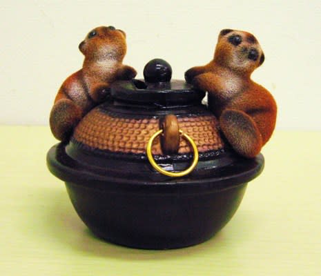 上の写真、可愛い子ダヌキ?ニ匹が茶釜によじ登っています。陶器製、高さ12センチです。