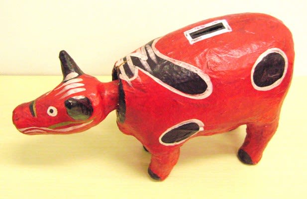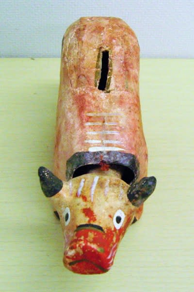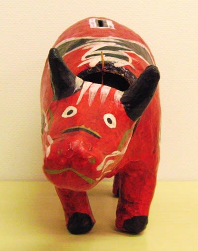 福島県の郷土玩具の代表格で、首振り張り子の中でも一番メジャーな張り子、赤ペコの貯金箱を収蔵しました。