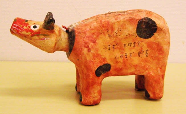 経年で、すっかり色落ちしていますが、形や首振り動作はしっかりしています。ペン書きで、「福島県貯蓄推進委員会」と写真の向こう側、お腹部分に書き込みが有ります。どんな経緯が有るのでしょうか。