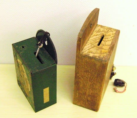 組み込み式で、かなり高級に作られています。正面に「つもり貯金箱」、「黄金の山も小金から」と書かれています。写真に写っている古い鍵が付いていましたが、使用不能につき新品と取り換えました。古い鍵は、お金の変わりに貯金箱内に格納しました。これも壁掛け式です。壁掛け式が当時の流行だったのでしょうか。