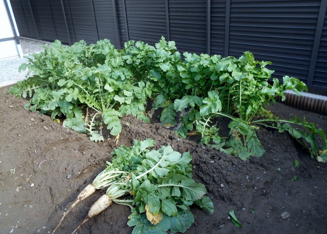もう一種、栽培中のネーミングが「からいね」の辛味大根を試し採りしました。同時に種蒔きしたネーミングが「ねづみ大根」は既に十分な大きさとなり全量収穫済みで辛味も程よく美味しく賞味しています。
