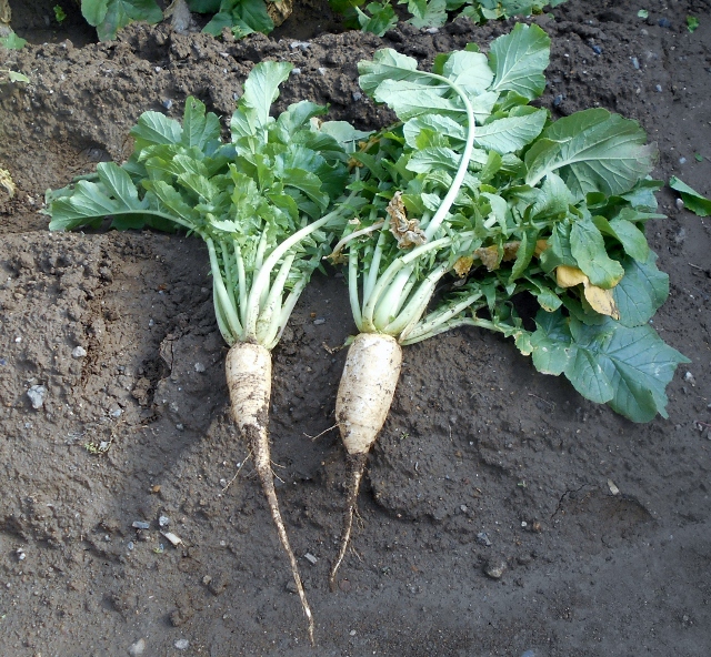 試し採り辛味大根のアップです。写真の右はほんの少し地上に迫り出していたものです。太さは十分ですが長さに未だ伸びしろがありそうです。左は地下に隠れていたもの、まだまだ成長段階です。茎や葉に陰りが見えるまで放置してみます。