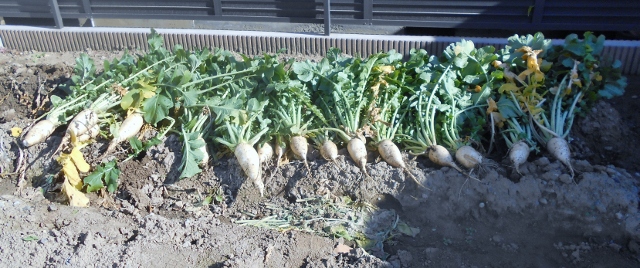 立派な葉は特に調理材料とすることも無く、地中に埋めて堆肥としました。跡地はご覧の通り綺麗に均しました。苦土石灰を撒いて、後はこのまま越冬します。来年はキュウリ・ナス・トマトの用地です。
