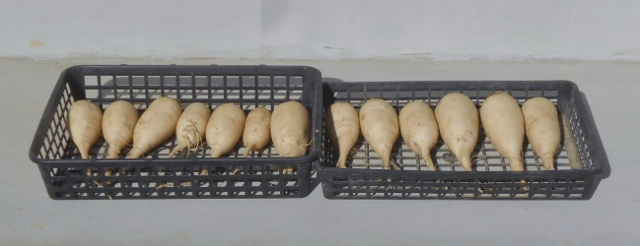 収穫した葉付の辛味大根です。確かに未だに葉の立派さに比べ実が貧弱です。