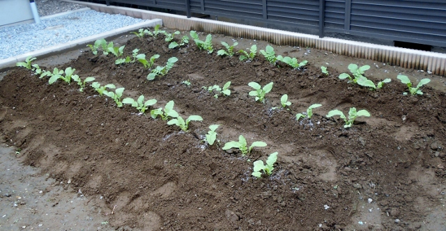 午前中に2~3本立ちにしていた大根苗を1本立ちにしました。本葉5~6枚頃が1本立ちのタイミングと言われ、そのタイミングを見計らっていたのですが、雨降り後で土も柔らかく作業もし易い事も重なり実施しました。どれもしっかりとした苗に成長し、どれを残すか思案しながら1本立ちにしました。