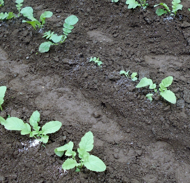 芽出しした後適度なお湿りで大根苗の成長は順調です。むしろ雨降りで苗の疎抜きや土寄せが出来ずしっかりとした成長への妨げになっていました。種を浅く撒いているので芽出しが早く苗の茎も成長が早い。土寄せが遅れると茎が折れてしまいます。