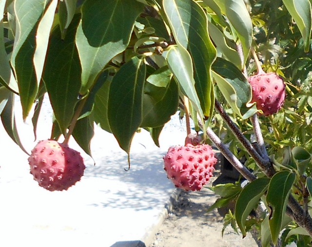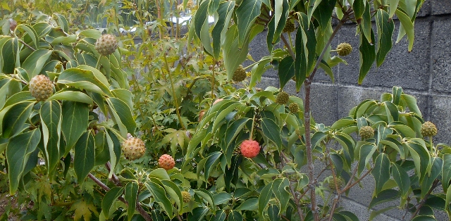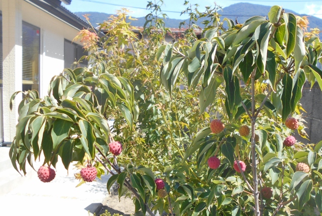 ヤマボウシの実の一部が直径2センチを超え赤く色づいてきました。