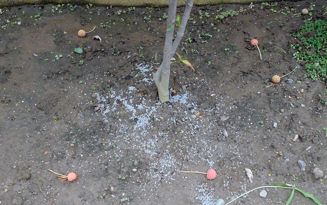 空き地に新たな花の球根を植え付けました。その後白く見える肥料を散布しました。これから上に桜の落ち葉を敷き詰めます。