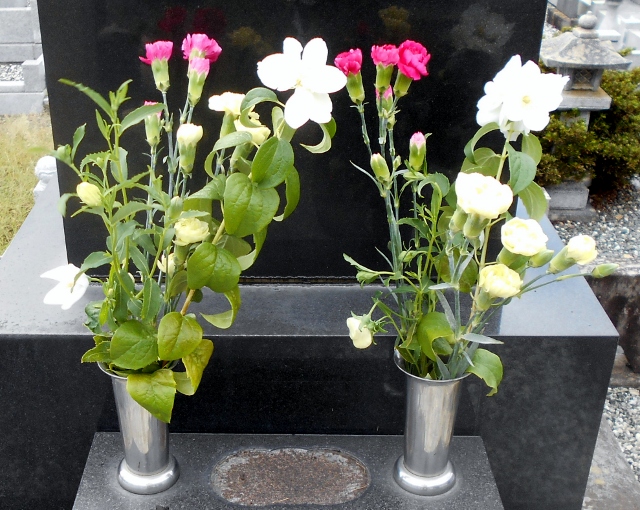 シンプルな我が家の墓地は雑草もなく綺麗が維持されていました。早速お花を供えました。今回は特に買い求めたお花に加え、我が家の庭で長期に渡り咲き続けている卯の花と桔梗も添えました。可憐に咲き続ける真っ白な花です。