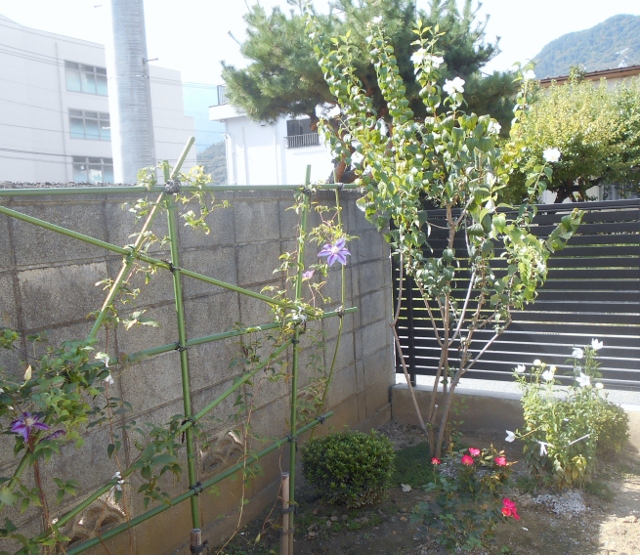 手前からテツセン、バラ、後ろに卯の花、桔梗です。これが今年の最後かも知れません。