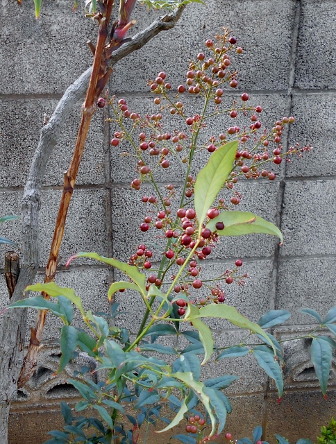 南天の実が赤っぽく大きく成り始めました。暑くとも季節の移ろいを感じます。