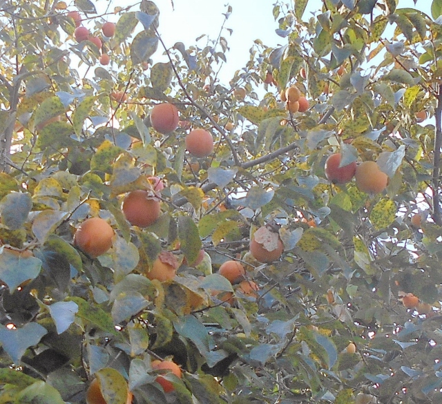 な~んだ? 柿の鈴なりです。赤く大きく熟してきています。美味しそう。