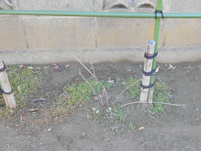 根元のアップです。昨年もこのやり方で好結果だったので良いと思います。結果が楽しみです。柵を新しい紐で締めなおしました。