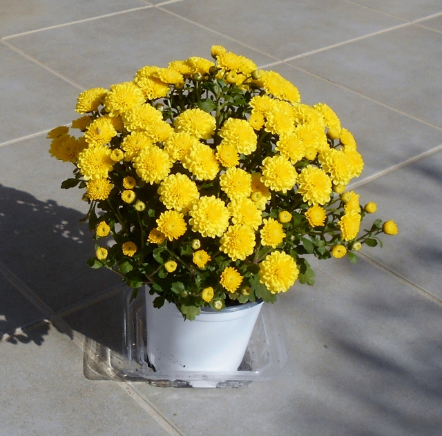 シンプルな植木鉢の菊の花です。小さな黄色の花が密集して満開です。穏やかな日差しの下で秋をアッピールしています。