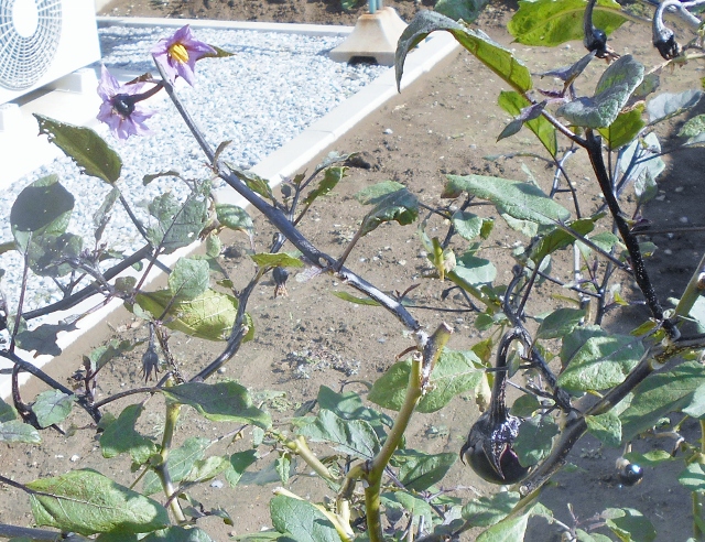 秋ナスです。十分な雨が有ると実が大きくなり、また元気に花を咲かせます。今年はずっと焼きナスなどで美味しく頂いています。何時迄続くやら。