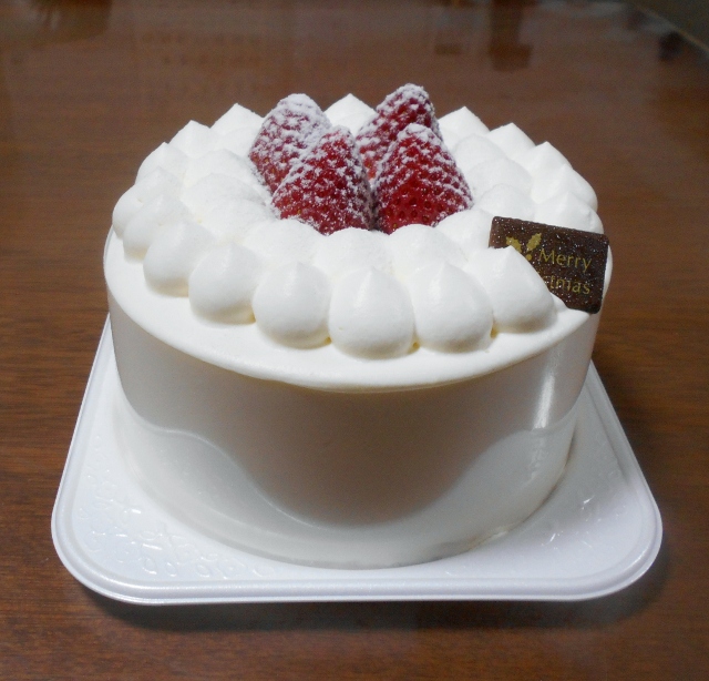 昨夜のクリスマスケーキです。飾りつけも少ないシンプルなものです。四等分し、二人で昨夜と今晩に頂きます。美味しかったです。