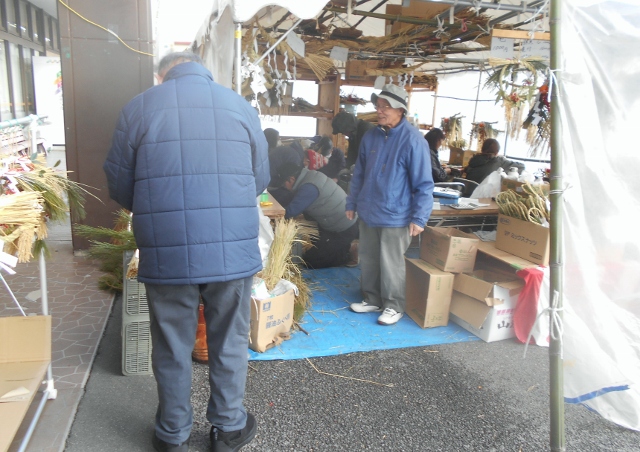 正月も間近となり、雪も降り止んだ午後に何時もの農協スーパーにしめ飾り等を買いに行ってきました。妻が仕事を退いた今年は例年より早めの調達でした。でも、最早しめ飾り販売は真っ盛りでした。ここはシニアグループの自作自販の特売場です。皆さんが和気あいあい、元気に楽しく作業中で年の暮れの風物詩です。