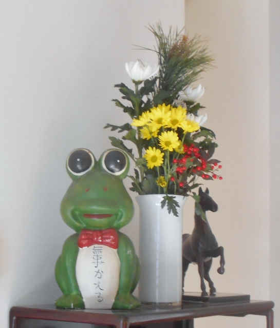玄関に正月気分の花等、来年の干支の午、「無事かえる」をお守りする大きな貯金箱のカエルを置きました。