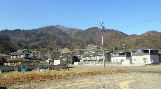 良い天気が続いています。戸倉上山田温泉の郊外です。田んぼの中にアパートや住宅が混在し、向こう山際には里山が望まれます。春も待ち遠しいのどかな光景です。