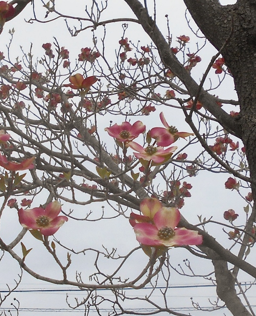 上の写真のアップです。枝木で年越ししたハナミズキが綺麗に咲きました。これから葉が出、実が生り、紅葉し、11月頃まで楽しませてくれます。