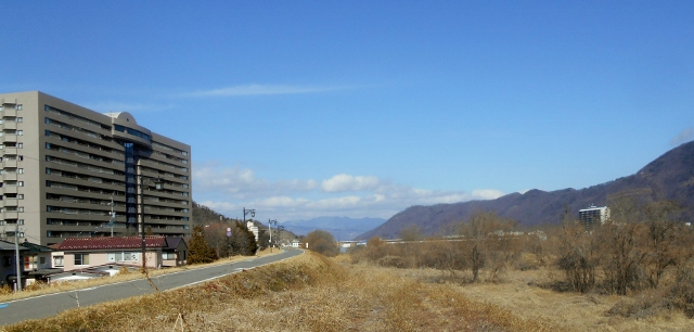 良い天気です。千曲川堤防道路から長野方面の光景です。河川敷は一面が枝木と枯草に覆われ冬景色ですが、ほのぼのとした温もりも感じられます。